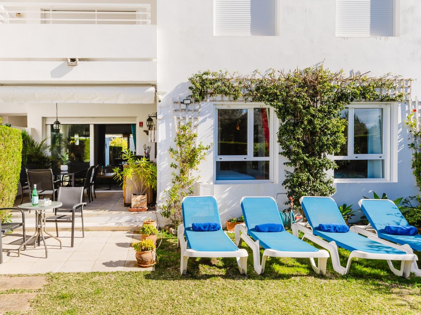 - Front garden (east): breakfast table, umbrella & morning sun