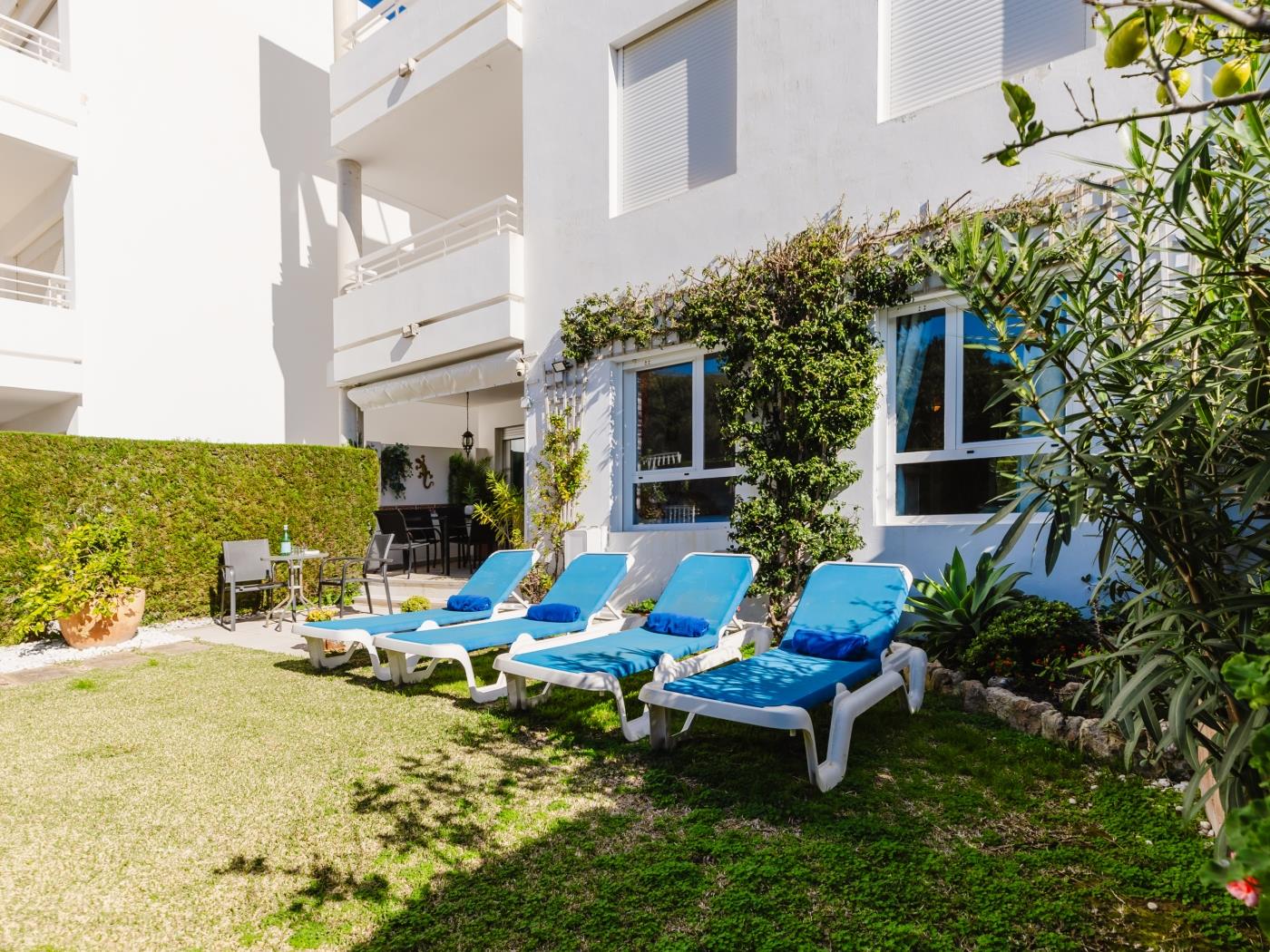 One of the apartment’s highlights is its two private gardens, fully enclosed and ideal for families. The rear west-facing garden enjoys afternoon sun, perfect for relaxing on loungers. A covered terrace with awning, a large dining table and a smokeless Weber electric BBQ make it ideal for evening dining outdoors.