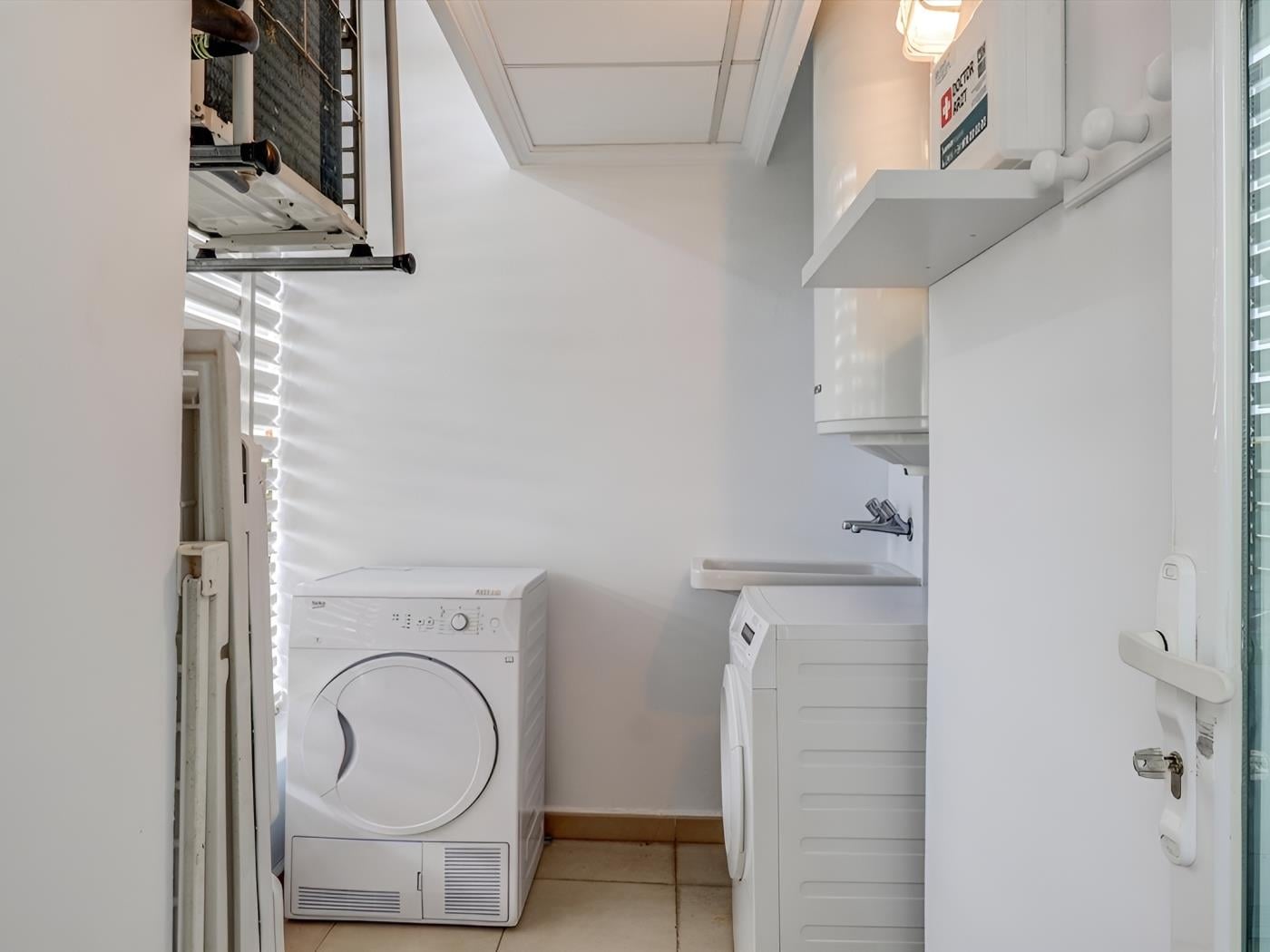 - Utility room with washing machine, dryer, ironing board & sink